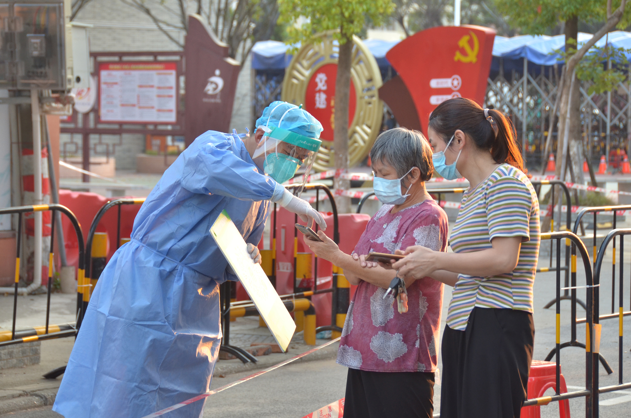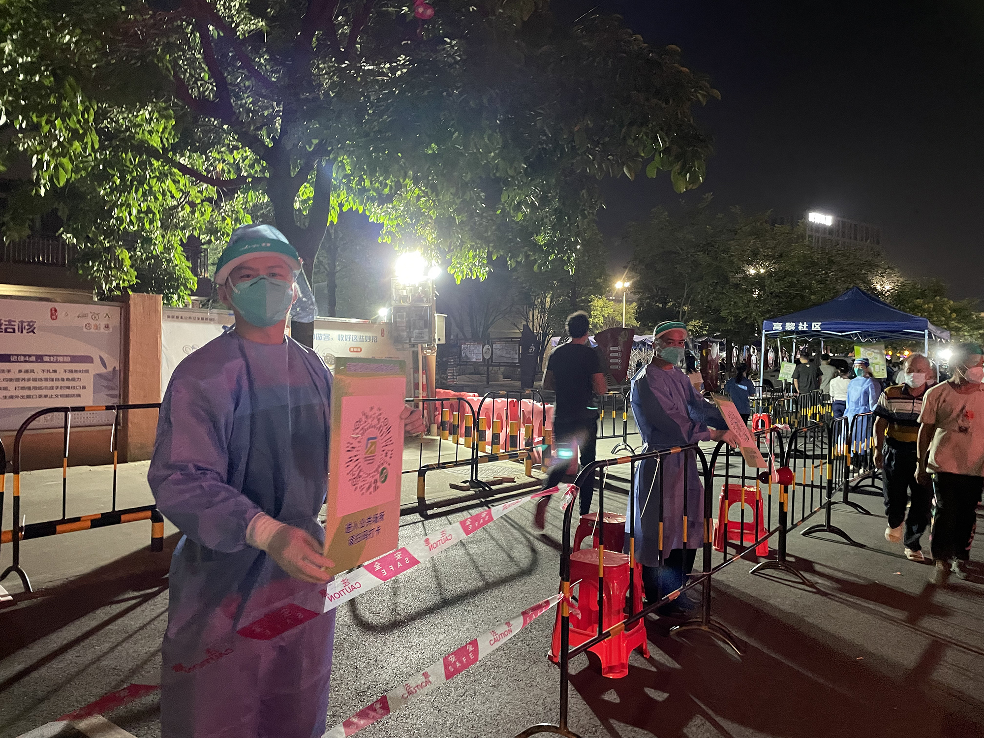 深秋驟涼,室外燈暖,為了保證疫情防控有序進行,鑫全利志愿者深夜依然在防疫一線上堅守。下圖為鑫全利員工協助高黎社區工作人員駐守核酸采樣點的入口。