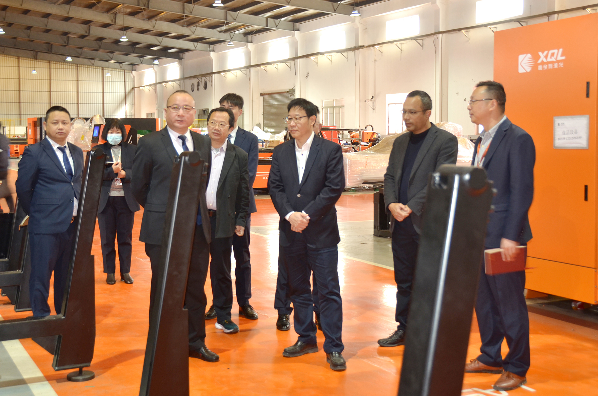 在鑫全利董事長王董等人的陪同下,劉涇波副市長一行參觀了鑫全利產品展區、生產車間,實地考察了激光設備制造流程與工藝,在平板切割、板管切割、機器人焊接、自動上下料等設備的現場演示,引起了各級領導的濃厚興趣和高度贊揚。領導們現場向王董了解激光切割、焊接技術的功能應用及市場前景,對鑫全利激光始終堅持自主創新的研發道路給予了高度肯定,對鑫全利激光工廠整潔的廠區環境和合理的區域布局表示贊許。