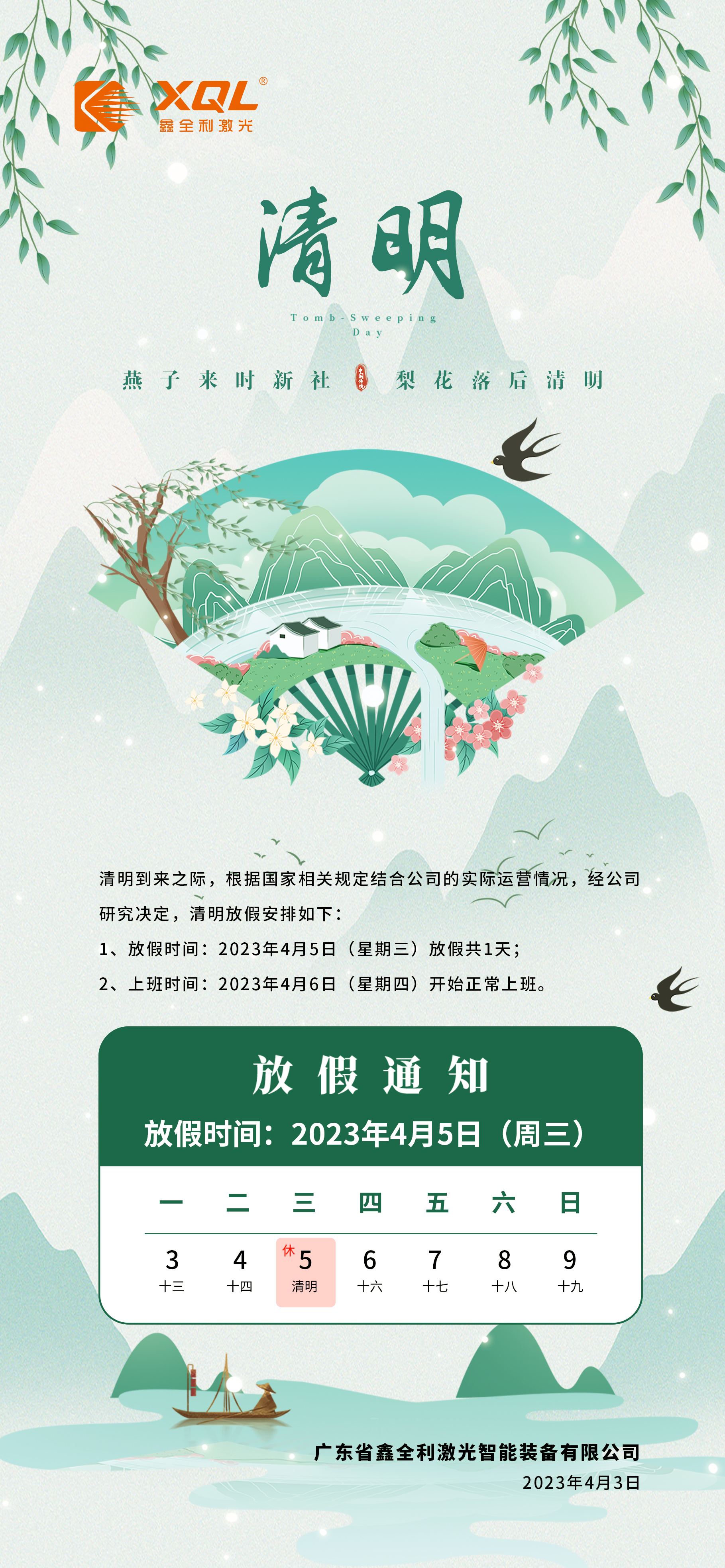 鑫全利激光清明節放假通知:4月5日放假,共1天;4月6日(星期四)起正常上班。溫馨提示:放假期間,我司暫停一切生產發貨安排,由此給您帶來的不便,敬請諒解!