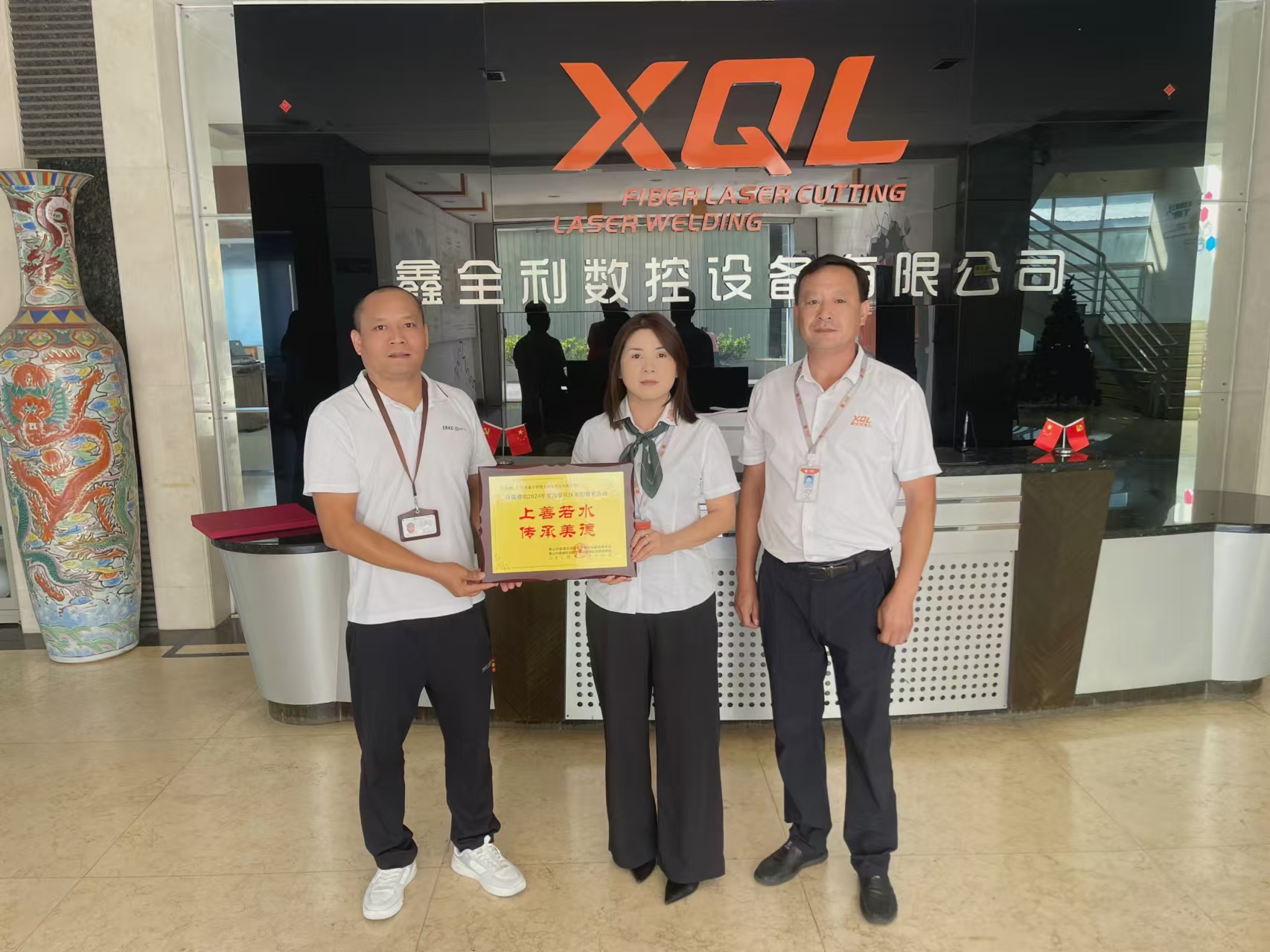 容桂高黎社區的工作人員為鑫全利激光頒發“上善若水,傳承美德”牌匾。這是對鑫全利激光熱心慈善、積極踐行公益事業的肯定與激勵。
