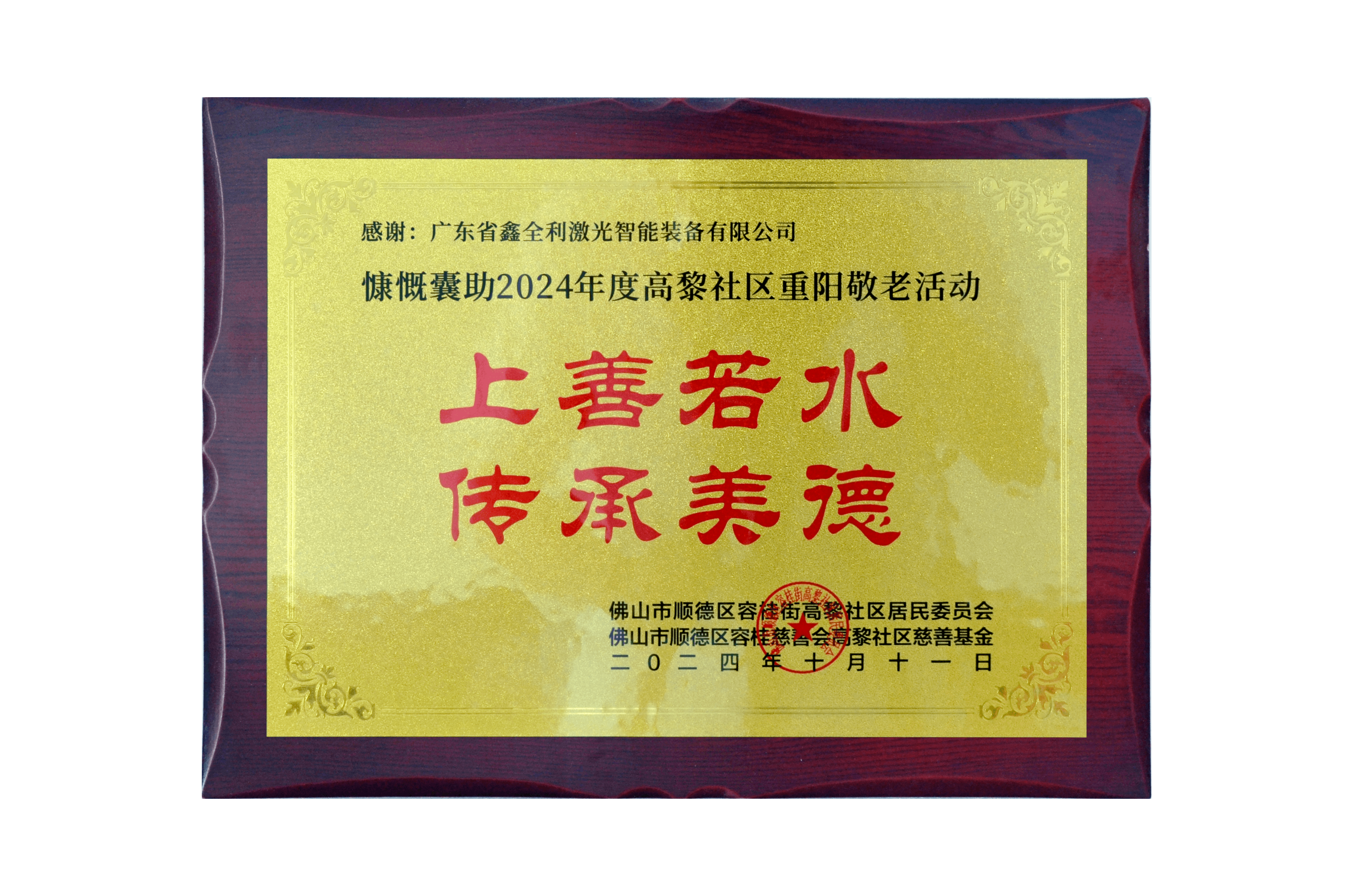 鑫全利激光始終秉承“取之社會,用之社會”的慈善理念,積極承擔社會責任,通過多種形式回饋社會。在2024年的重陽節活動,鑫全利激光積極響應容桂高黎社區的號召,參與重陽敬老捐贈活動并獲贈牌匾,用實際行動詮釋了企業的社會責任與擔當。