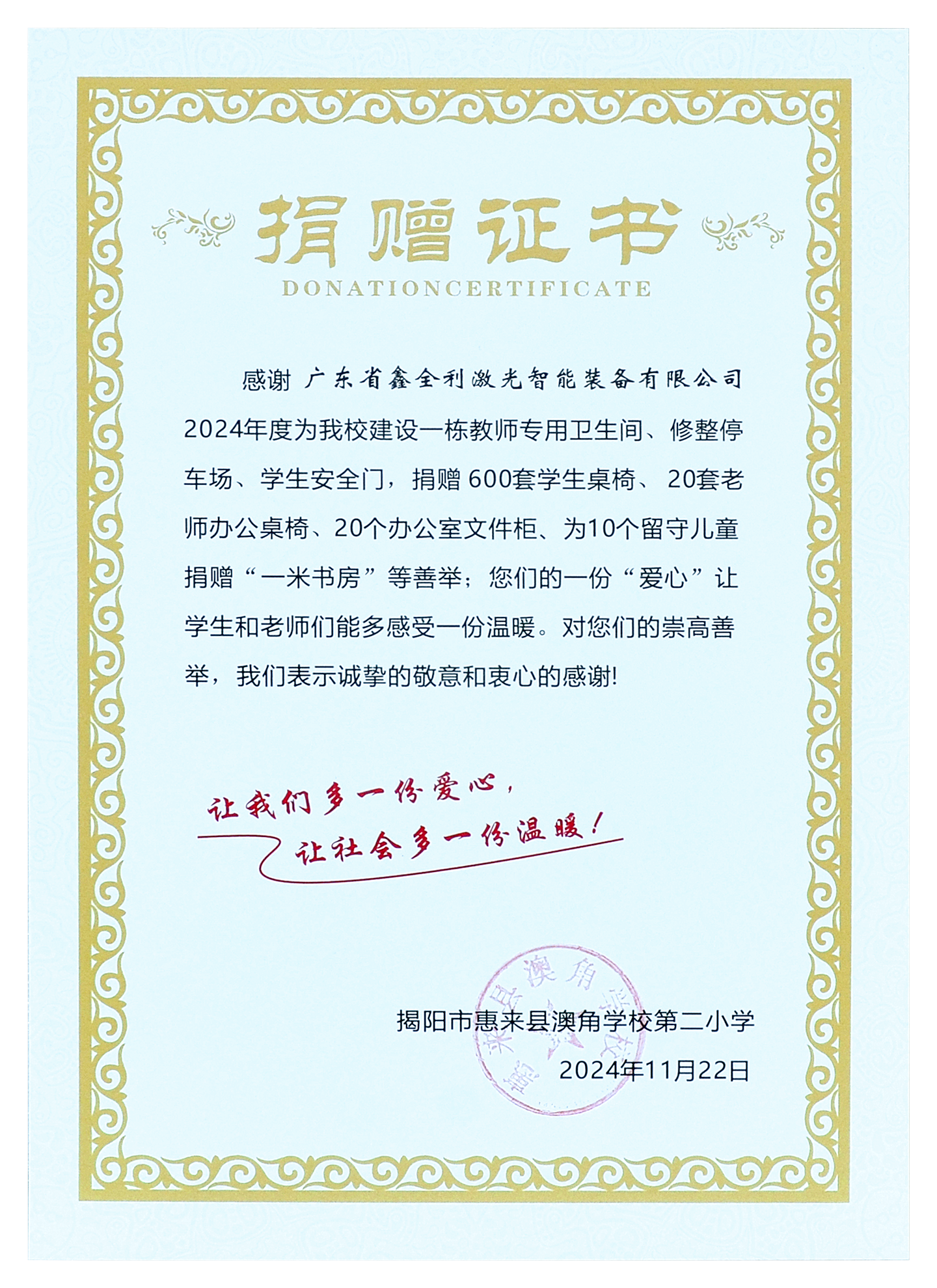 我們深信,鑫全利激光助力鄉(xiāng)村教育振興的涓涓細(xì)流,一定能吸引社會上更多的企業(yè)和個人參與到“百千萬工程”項目的洪流中,形成一股強大的社會合力,順利完成中共廣東省委關(guān)于實施“百縣千鎮(zhèn)萬村高質(zhì)量發(fā)展工程”,“一年開局起步、三年初見成效、五年顯著變化、十年根本改變的目標(biāo)”。