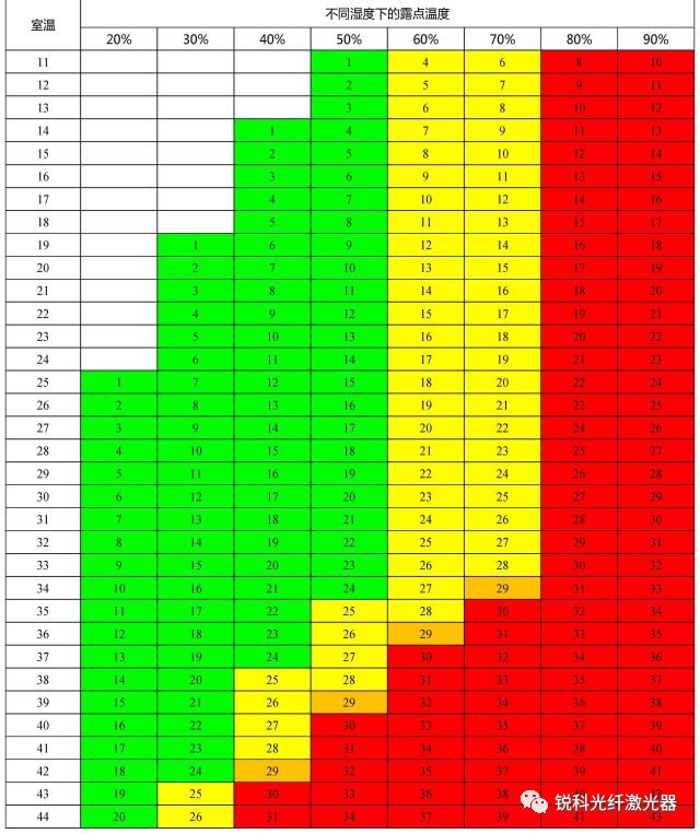 圖源(銳科激光器):左側是當前工作環境溫度,頂邊是當前工作環境濕度,溫度和濕度參數的交叉點溫度就是此環境下的“露點溫度”。 也即:在此環境中任何處于這個露點溫度以下的物體,其表面就會結露。