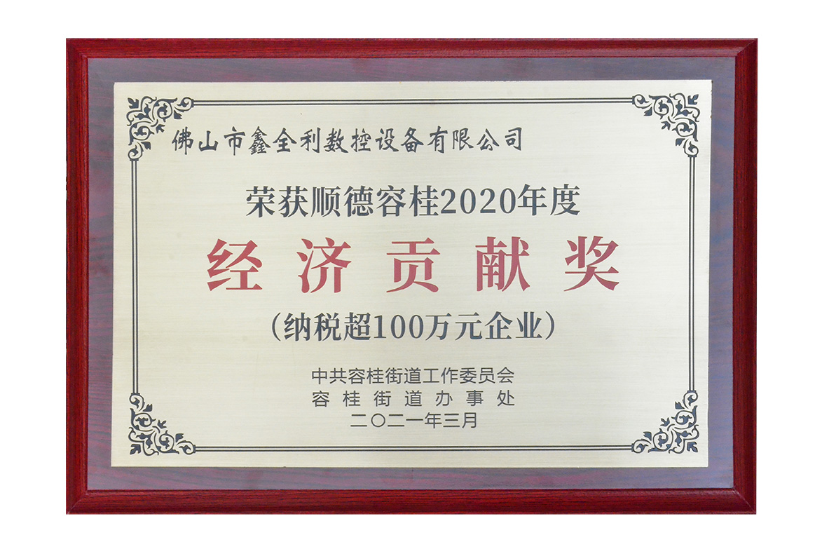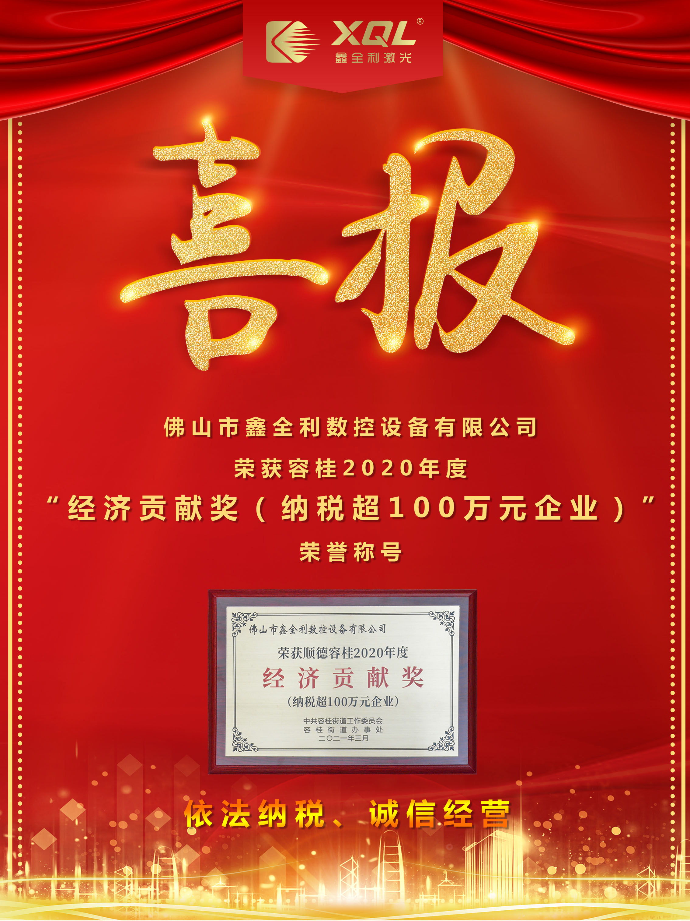 鑫全利激光榮獲容桂2020年度“經(jīng)濟(jì)貢獻(xiàn)獎(jiǎng)(納稅超100萬(wàn)元企業(yè))”榮譽(yù)稱號(hào)!
