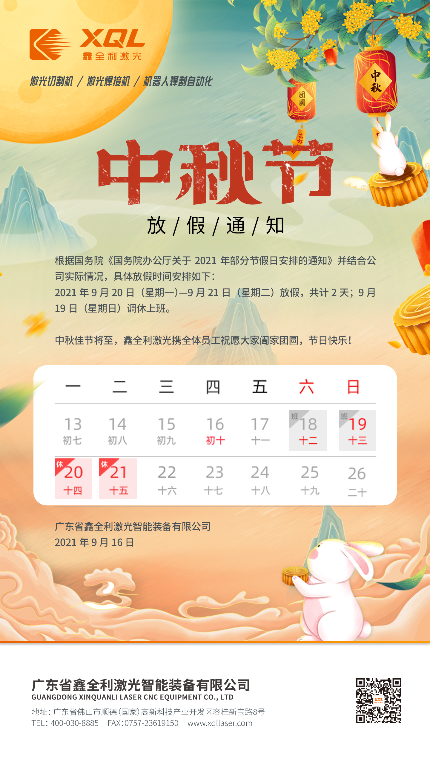 鑫全利激光中秋放假通知:9月20日(星期一)—9月21日(星期二)放假,共計2天; 9月19日(星期日)調休上班。放假期間暫停發貨,請廣大客戶提前做好備貨計劃,給您帶來不便,敬請諒解!