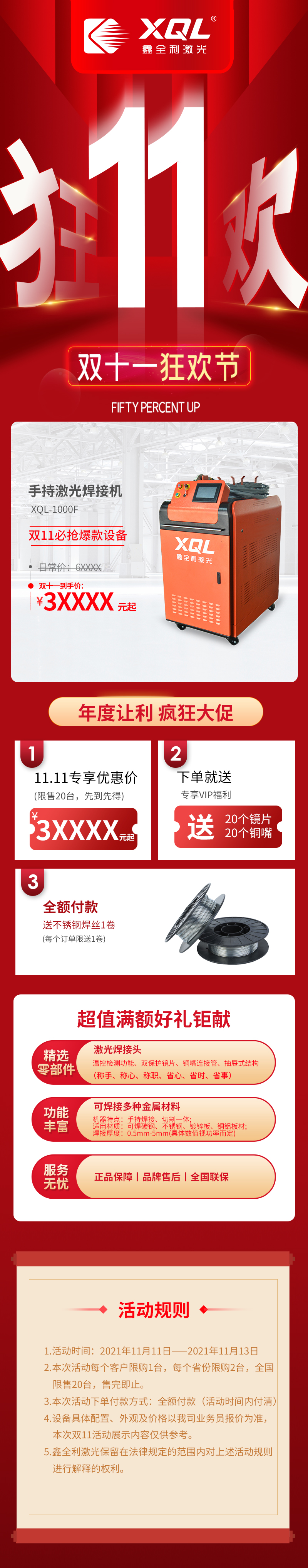 為慶祝一年一度的雙十一年底狂歡購物節,鑫全利特推出:“利潤脫光光,特價送禮成雙雙”活動,針對手持激光焊接機,推出全年優惠價3XXXX元?。?!全國限售20臺,先到先得。